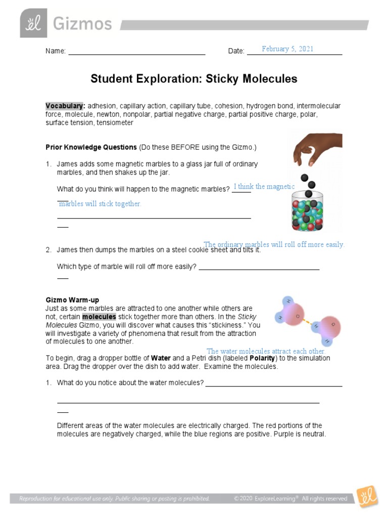 Any two complementary cohesive ends can anneal, even those from two different organisms. 2020 sticky molecules answer key vocabulary: Sticky molecules answers / what makes a substance greasy or sticky on a molecular level? Adhesion makes a water drop a drop. Access to all gizmo lesson materials, including answer keys.